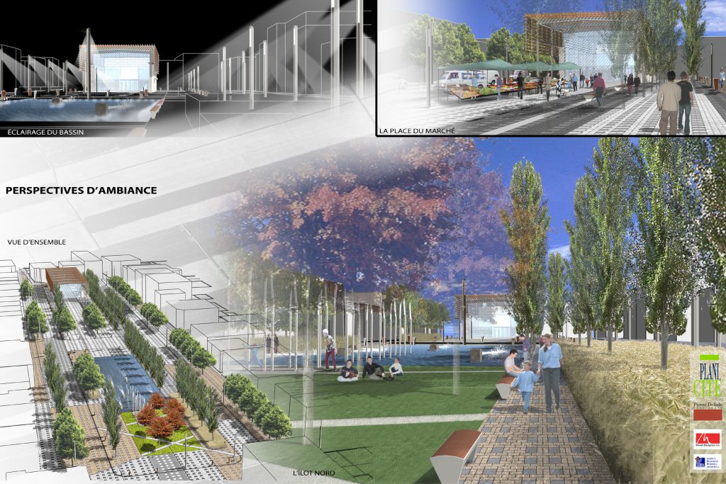 Nous avons travaillé avec l’équipe de Plania (Plani-cité) pour proposer la construction d’un nouveau marché public sur la place Bourget à Joliette, dans le cadre d’un concours d’architecture et d’aménagement tenu par la Ville de Joliette.